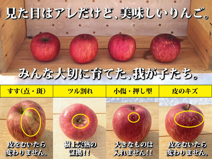 お客さまへ安全で美味しいりんごをお届けするために、商品には万全を期しておりますが、万が一商品に不具合(軟化、腐れ、果肉まで広がった芯カビ、過度な蜜褐変、配送時の事故によるキズ等)がございましたら、「ご注文番号」をご記入のうえ、不良品の個数、状態を【お問い合わせフォーム】よりご連絡ください。メッセージを確認次第、速やかに問題があった個数分の返金にて対応させていただきます。